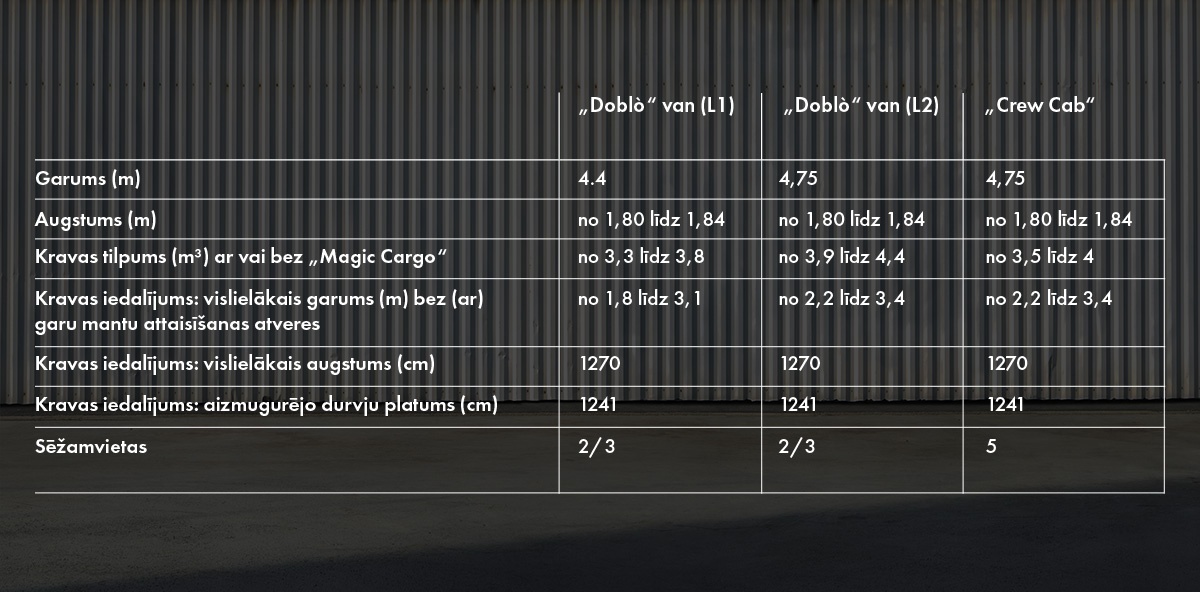 Visa jaunā “Doblò” vide ir piemērota Jūsu vajadzībām. “Doblò” ir universāla komercijas automašīna, viena no labākajām savā kategorijā, kurā iespējams izvēlēties dažādas sēdekļu un vides konfigurācijas, tādā veidā nodrošinot vislielāko automašīnas vadīšanas komfortu, pārvadājot visdažādākās kravas. Liela uzmanība tāpat tiek pievērsta akustiskajam komfortam, samazinot vidējo trokšņu līmeni salonā.